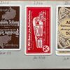 Musterbuch, links von 2 Büroklammern gehalten. Kurz vor dem Verkauf seiner Deutschen Spielkartenfabrik an die VASS 1931 hatte Walter Scharff in Ennetbaden (Kanton Aargau, Schweiz) die Wasco AG gegründet, die Spielkarten unter der Marke Helvetia vertrieb. Die Wasco blieb bis 1936 bestehen, als Walter Scharff eimigrieren musste. Der Markenname Helvetia ging an die VASS. Unser Muster buch zeigt auf 25 Bl. 153 Rückseiten von Werbekarten, 6 Hüllen und 5 Beilagen, welche die Produktionsnummern 2327 bis 2455 verkörpern. Sie sind alle handschriftlich in Tinte bezeichnet, zum Teil mit dem Namen des Auftraggebers (“Bendigsen, holmblad...“), sonst mit „Pik.“ (wohl fur Piquet, 32 Bl.), „Bridge“, „Gaigel“, „Tapp“, „Pr.“ (preussiches Bild), „Chemn.“ (Chemnitzer, sächsisches Bild), „Bayr.“ (bayerisches Bild)... Eine Verpackung mit Weihnachtsmotiv für die Auto Union ist datiert 1940. Hübsches Kaleidoskop aller möglichen deutschen Firmen.
